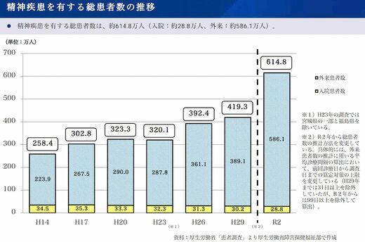 先日、厚生労働省の統計を見て驚いた。精神疾患を有する総患者数は約614.8万人もいて、外来は約586.1万人にもいたる。このなかには認知症も含まれている。だからすべてが気分障害ではない。しかし、予想以上にその数の多さに驚いた。