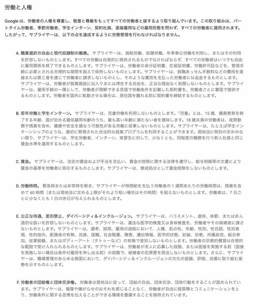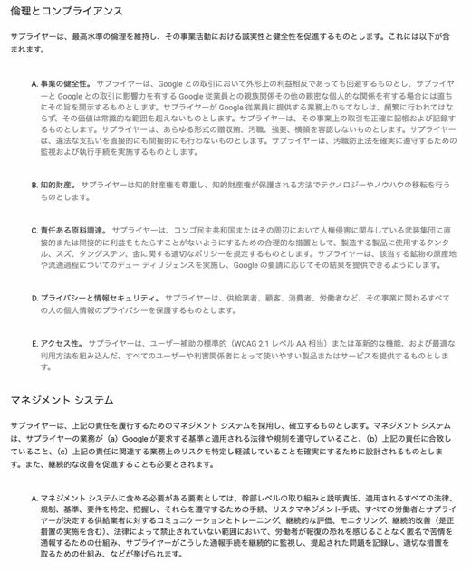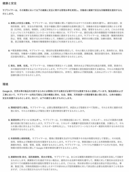 Googleのサプライヤー行動規範は、こんなにもしっかりと定義されているのだ(画像:googleより)