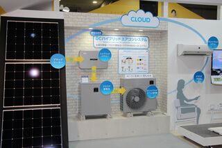 同社が展示場で目玉としたのが、交流(AC)と直流(DC)のどちらの電流も受けられる業界初のハイブリッド型エアコン。通常、太陽光発電が生む直流の電流を使ってエアコンを動かす場合、パワーコンディショナー(パワコン)で交流に変換する必要があるが、このエアコンは直流のままでも使える。電流の変換ロスがなくなることで、約5%の省エネ効果があるという。同社は蓄電池とセットにしたHEMSのシステムとして年内に発売する方針だ。同時に、新開発したモジュール変換効率19.1%の住宅用単結晶太陽電池モジュールを積極投入していく。