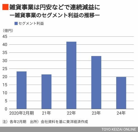 調達面の見直しも必要になる。すでに一部の商品を商社経由でなく上海子会社から仕入れるルートに切り替えた。生産国の見直しも検討し、今後は東南アジアの生産拡大やインドでの生産も視野に入れる。こうした取り組みで、雑貨事業の利益率は2023年度の2.7%から、2021年度の6.7%程度に戻していく方針だ。