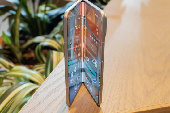 新機種の特徴は、広げた時の薄さ。厚み約5.1ミリで、日本市場で販売されている折りたたみスマートフォンとしては最も薄いものとなる。たたんでも10.5ミリなので、ちょっと厚目のスマートフォンといった程度だ。