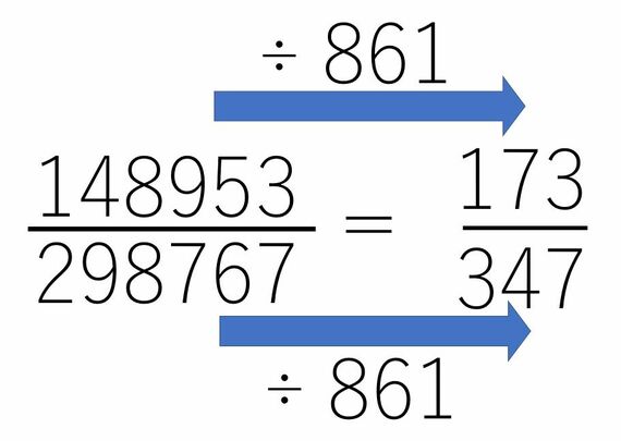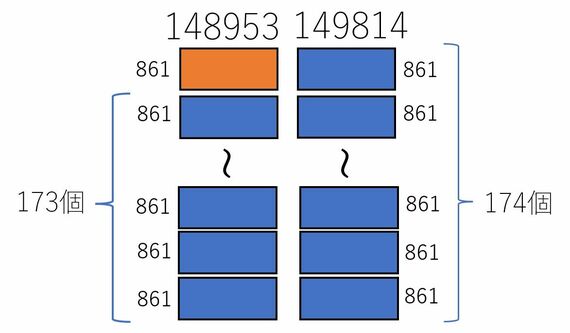 173と174で、その間は1しかありません。861の箱が173個積み上がったのが148953で、174個積み上がったのが149814ということになります。そして、173個+174個=347個が積み上がったのが298767となるわけですね。