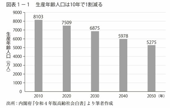 このデータを見ると、10年で約1割のペースで生産年齢人口が減少しています。皆さんの会社の社員数が10年ごとに1割ずつ減っていく状況をイメージしてください。そうやって人が減り、多くの組織が深刻な人手不足に悩まされるおそれがあるのです。
