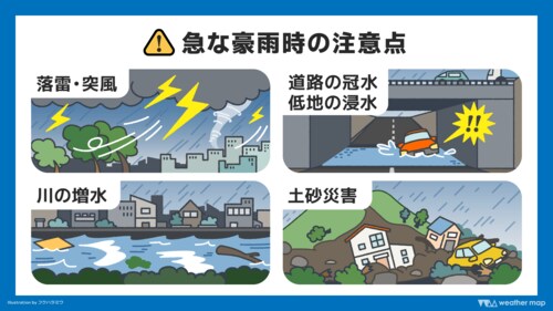 移動中の場合は、アンダーパスなど周囲より低い場所を避けるようにしてください。中小河川の増水や氾濫、土砂災害のおそれがあるため、危ない場所には近づかないことも重要です。