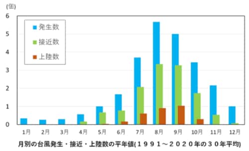 台風の発生数と日本への接近数が最も多いのは8月、日本への上陸数が最も多いのは9月です。湿った空気が流れ込みやすくなる時期なので、引き続き、天気の急変に気をつけてください。