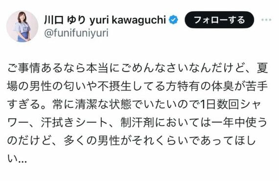 事の発端は8月8日、川口さんは自身のX(旧Twitter)に「ご事情あるなら本当にごめんなさいなんだけど、夏場の男性の匂いや不摂生している方特有の体臭が苦手すぎる。常に清潔な状態でいたいので1日数回シャワー、汗拭きシート、制汗剤においては一年中使うのだけど、多くの男性がそれくらいであってほしい」などと投稿し、すぐに批判が殺到。9日に釈明の投稿をするものの、火に油を注ぐ結果となってしまいました。