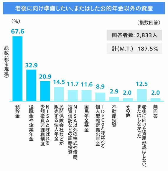 内閣府が2024年3月に発表した「生活設計と年金に関する世論調査」※1によると、「公的年金以外の資産をどう準備したいか」という問いに対する回答で最も多かったのは「預貯金(67.6%)」。次いで「退職金や企業年金(32.9%)」、続き「NISAと呼ばれる少額投資非課税制度(20.9%)」の順番となっている。