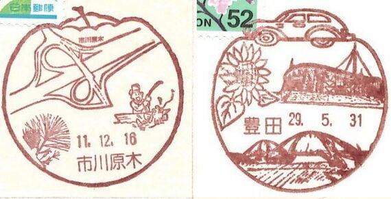 豊田市は、いうまでもなくトヨタ自動車の本拠地であり、日本の自動車産業の歩みを体現した都市でもある。そのため、豊田市内にはほかにも自動車を描いた風景印を持つ郵便局が複数ある。