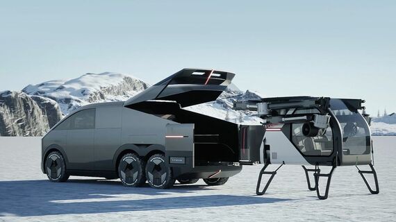 一方、地上走行ユニットはレンジエクステンダー型EV(訳注:航続距離を延長するための発電専用エンジンを搭載したEV)のピックアップトラックで、4~5人が乗車できる。飛行ユニットは充電ステーションを兼ねた荷台部分に搭載する。