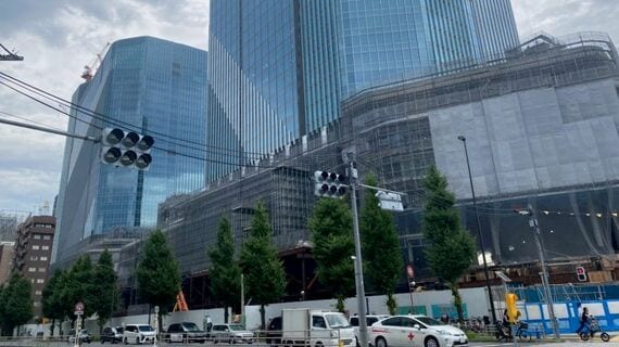 カンカンカーン、ガラガラガラ――。今年8月初旬、JR山手線・高輪ゲートウェイ駅の改札を出ると、周辺に工事の音がこだましていた。ガラス窓の通路を抜けて、町側に降りていく。すると建物の躯体が浮かび上がってきた。