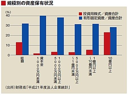 図は、2009年度末に企業が保有する資産のうち、「投資用株式」と「有形固定資産」の2項目を取り上げ、総資産に対する比率を規模別に見たものだ。