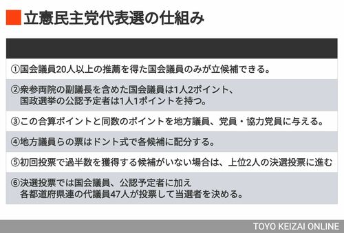 立憲党内には自民の派閥と同様に複数のグループが存在する。その中で、旧立憲民主党の生みの親である枝野氏はコアな党員からの支持を背景に、推薦人も確保できたとみられる。また野田氏には首相経験者としての安定感があり、党内の若手・中堅からなる「直諫の会」が出馬要請し、小沢氏のグループも推す構えで、推薦人確保は確実だ。一方、党関係者は「泉氏でも推薦人確保には不安があり、馬淵氏は極めて困難」と指摘。さらに吉田氏についても「若手や女性が総決起しない限り出馬は困難」とみている。