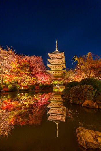 国宝・五重塔は1644(寛永21)年の再建だが、現存する木造建築で日本一の高さを誇る。密教の教えを空海が表した講堂の立体曼荼羅(まんだら)も壮観だ。