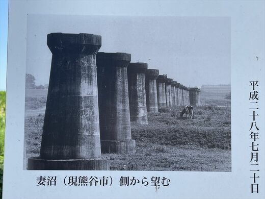 しかし、利根川北岸の堤外に、現在も1基だけがポツンと残っている。高さ7~8mはあろうかという橋脚は、戦中・戦後の資材不足の時代に造られたからだろうか、なんとなく不格好に見えるが、熊谷線の歴史を物語る貴重な遺構である。