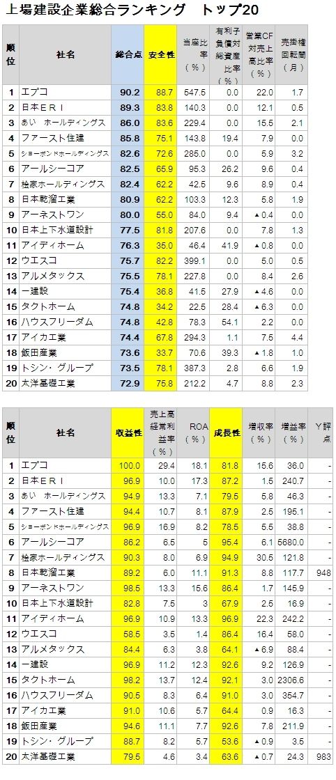 上場建設企業を対象に、安全性、収益性、成長性の3つの観点から、当座比率や売上高経常利益率など8つの指標を元に、総合評価(100点満点)を高い順にランキング、上位20社を掲載したものが、以下のランキング表だ。Y評点とは、建設企業が公共事情を受注する際、官公庁による経営事項審査の1つであり、この数値が高いほど、財務健全性がよい。