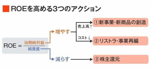 「ROE=当期純利益÷純資産」で、ROEを高めるには、「当期純利益を増やす」か、「純資産(=自己資本)を減らす」必要があります(あるいは両方)。具体的には、企業には以下3つの主要なアクションがあります。