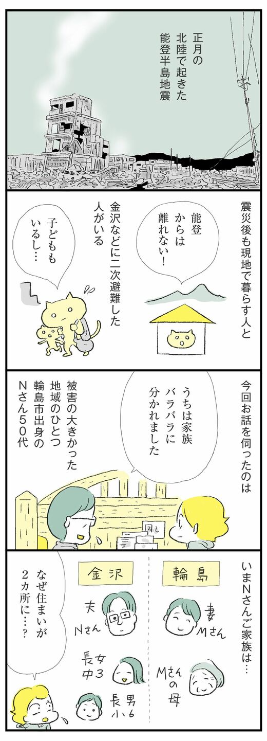 震災後、家族の事情から住まいを2カ所にして暮らすNさんにお話を伺いました(漫画:ハラユキ)