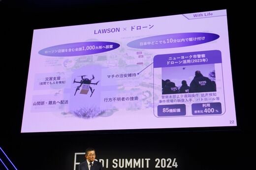 その象徴的な計画として、ローソン店舗全国1000箇所にドローンを配置することを挙げた。「事件があったときに10分以内にドローンで駆けつけることができる」と説明する。ドローンの配備が進んでいるニューヨーク市警の例を引き合いに出しながら、その実現可能性を示唆した。