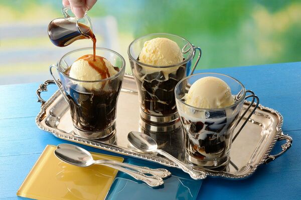珈琲ゼリーには「ココナッツミルク」と「アフォガートビター」(各390円)の2種類のフレーバーが登場した。いずれも、バニラアイスクリームをトッピングした珈琲ゼリーの上に、好みの量だけ回しかけながら食べるタイプのデザートだ。