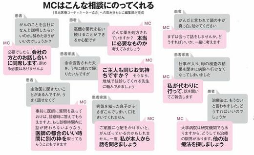 相談によっては、がん相談員やソーシャルワーカー、栄養管理士などに相談することもできるが、多くは院内でのサポートで、受付時間も限られている。その点、MCは個人が独立して活動しているため、いつでもどこでも対応してくれる。医療の“顧問弁護士”のような存在といっていいだろう。