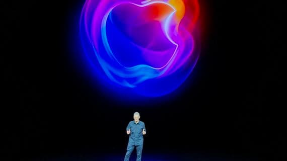 Apple Park Steve Jobs Theaterで世界のプレスに向けて、舞台挨拶をするTim Cook CEO(筆者撮影)