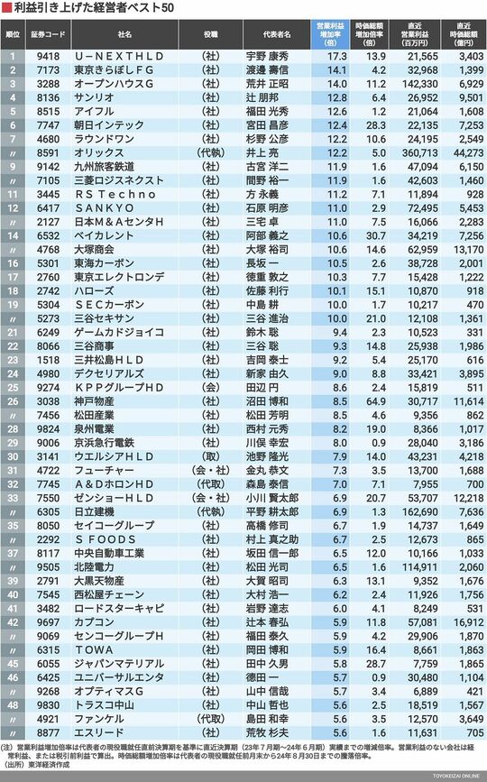 政治・経済・投資 企業の「稼ぐ力」を伸ばした"凄腕"経営者は誰か? トップ在任期間中の利益拡大率をランキング 3分で読める 公開日時:2024/09/15 06:00 山田 泰弘 東洋経済 記者 フォロー 1/3 PAGES 2/3 PAGES 3/3 PAGES 【2024年9月15日17時05分 追記】初出時、表の東京きらぼしFGの直近時価総額に誤りがあったため、修正しました。