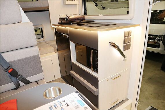 まず、内装では、テレビ台と調理台まわりに照明を追加。また、ダイネットにもカーテンや照明を加えることで、さらに高級感をアップしている。加えて、テーブル横にはドリンクホルダー(4つ)を備え付けて利便性をアップしたほか、サードシートの座り心地も改善。ダイネット後方にあり、トイレなどを備えられるマルチルームには大きなミラーと収納棚、ハンガーパイプ、防水パンも装備。これらすべてが標準設定となっている。