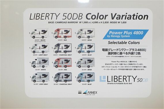 前述のとおり、このモデルのようなコンパクト系キャブコンは、近年需要が高く、他メーカーでも同様のモデルを続々とリリースしている。そうした中、リバティ50DBは、電装系装備を充実させるだけでなく、ボディ色まで選べるというオプションセットを新設定していることが斬新だ。