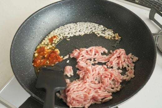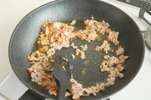 にんにくが軽く色づいてきたら、豚の挽肉と豆板醤を加えます。混ぜ合わせ、さらに加熱してきます。
