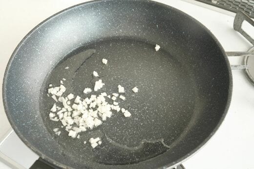にんにくはみじん切りにします。フライパンにサラダ油をしき、みじん切りにしたにんにくを加え、中火にかけます。