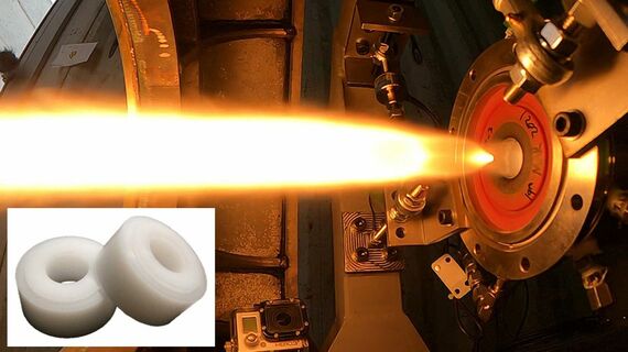 プラスチック(写真左下)と液体酸化剤を組み合わせ、安全かつ高推進力のエンジンを開発