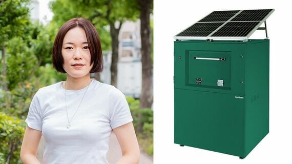 西山代表(写真左)は父親が発見した微生物群を生かした「スマートコンポスト」(右)を開発
