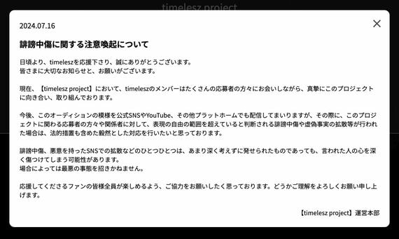 timelesz(タイムレス)の新メンバー募集オーディションの様子を追う『timelesz project-AUDITION』(通称タイプロ)が配信開始され、Netflixで1位(日本のテレビ番組ランキング部門)になるなど、話題となっている。