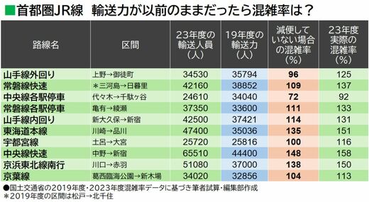 これらの路線は2023年度の混雑率がいずれも140%以下だが、もし以前の輸送力であれば最大で110%台前半だった計算だ。
