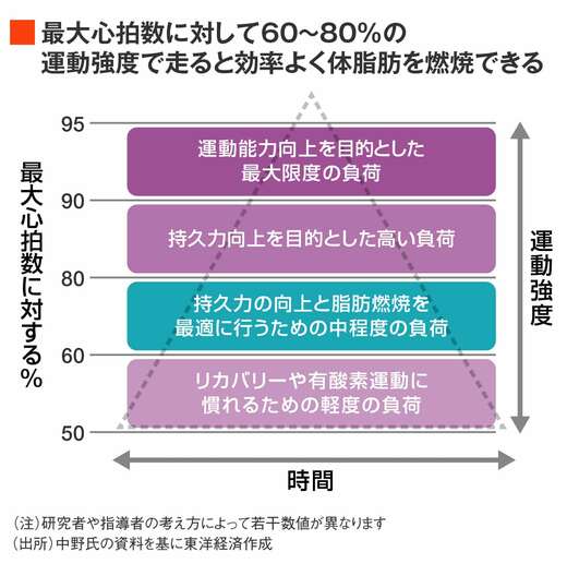 「主観的な運動強度だと『ややきつい』から『きつい』ぐらい。心拍数で言うと、最大心拍数(220から年齢を引く)に対して60〜80%くらいの数値を保ちながら走ると、より効率よく体脂肪を燃焼できます。いわば“脂肪燃焼ゾーン”ですね。逆に、心拍数がこの範囲外だとあまり燃えないからもったいない。いろいろなメーカーから心拍計が出ているので、トレーニングの際には活用すると便利です」