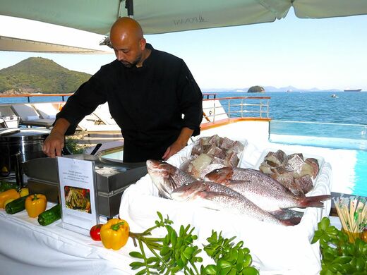 島への上陸は南極などで使うゾディアックという硬いゴムボートに乗り冒険心を掻き立てる。水面下のラウンジの大窓から眺める海中模様は動く水族館のようだ。