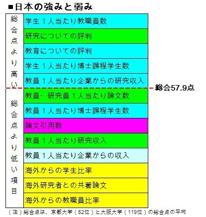 しかし、これは単なる結果であって、それよりも、日本の大学がどういう問題を抱えているかという点をよく見てほしい。日本が特にほかの国から後れをとっているのは、大学としての収入やグローバルな展望という点。
