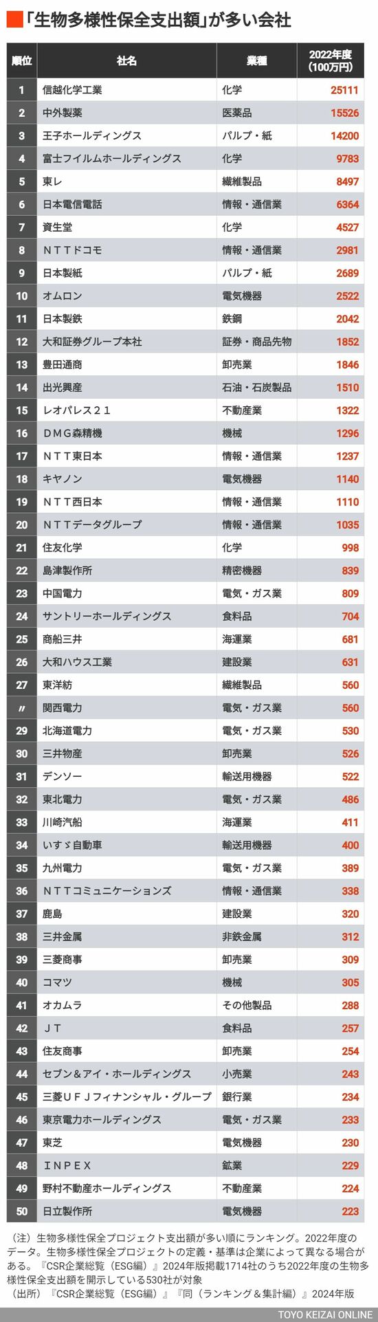ビジネス #CSR企業総覧 前の記事 次の記事 「生物多様性保全」への支出額が多い企業トップ100 取り組みは進んでいるもののTNFD対応は道半ば 4分で読める 公開日時:2024/09/29 13:00 伊東 優 東洋経済『CSR企業総覧』編集部 『会社四季報・未上場会社版』編集長 フォロー 1/4 PAGES 2/4 PAGES 3/4 PAGES 1~50位 次ページが続きます 4/4 PAGES