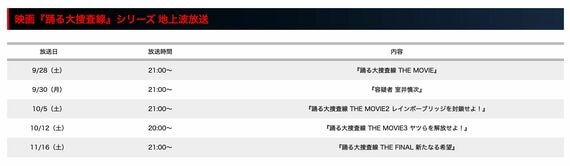 さらに9月28日から11月16日にかけて過去の映画全4作とスピンオフ映画「容疑者 室井慎次」を一挙放送。映画全4作の地上波一挙放送や、最新リマスター版(4Kリストア版)の地上波放送は初めてであり、TVerやFODでの無料配信も含め、同シリーズのファンを喜ばせています。