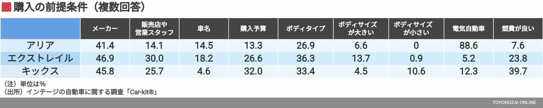 似た構造として、アリアは「ボディタイプ」へのこだわりも他の2車種より低い。「SUVがほしい」というよりは、航続距離が十分にあるBEV、その中でも国産がよいというニーズに合致した結果だと言える。