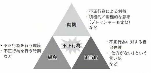 不正のトライアングルでは、不正行為は、「①利益の獲得やプレッシャーといった動機」と「②不正を行うことができる環境や時期といった機会」、「③行為は仕方がないものだという正当化」の3つの要素が結びつくことによって起こるものだと説明されています。