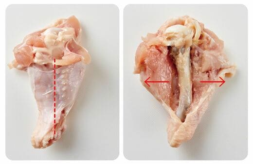 手羽元の骨が見える面を上にして置き、骨の真上に包丁で切り込みを1本入れ、肉を左右に開きます。骨と肉がくっついているところは、骨と肉の間に包丁を入れて骨から肉をはがしながら開くと良いでしょう。