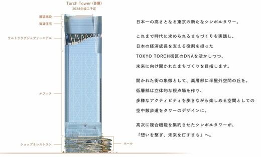 例えば、2027年竣工予定で完成すれば日本でもっとも高いビルとなる「TOKYO TORCH」。デベロッパーは三菱地所だが、中層階にはぎっしりオフィスが入り、高層階には「ウルトララグジュアリーホテル」が入居。そして、低層階には独特の曲線が見られる建築があり、地上にはいい感じに緑がある。