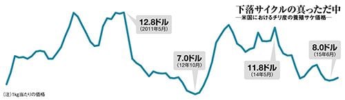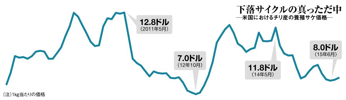 コストコなど米国の大手スーパーの店頭では、2014年末に1ポンド=7.99ドルで販売されていたサケが、6月後半には5.99ドルへ下落。価格安により需要が喚起され、チリ産養殖サケ相場は7月から、じりじりと上値を探りだした。