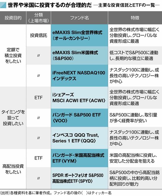 ここでは目的別に投信とETFで利益を狙える銘柄を一覧にしたので参考にしてほしい。