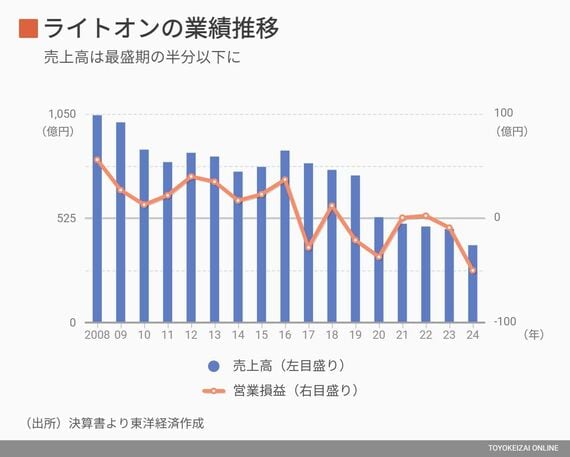 10年の推移を見たものだが、ライトオンは新型コロナのだいぶ前から好調とは言いがたい。2015年には売上高が782億円で営業利益が23億円だったところ、2024年には売上高388億円、営業利益▲50億円(営業損失50億円)となっている。ライトオンは長期にわたる不振に悩んでいるといっていい。