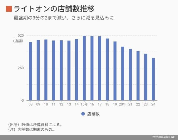 ライトオンは現在、全国で340店舗あるが、最盛期の2015年8月期には516店舗を数えていた。24年8月期も、2店舗の出店と35店舗の退店で純減33店舗だったが、この先、どの程度まで減ることになるのか。