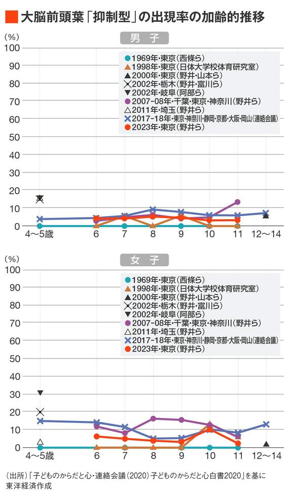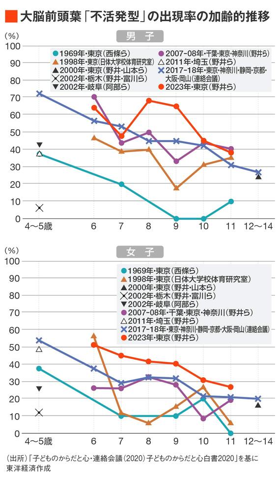 「⼦どものからだと⼼の全国的共同調査」(子どものからだと心・連絡会議、2018年実施)で保育園児から中学生まで約4200名に前頭葉機能検査(go/no-go 課題)を行ったところ、物事に集中するのに必要な“興奮”の「強さ」と気持ちを抑えるのに必要な“抑制”の「強さ」とが、ともに⼗分育っていないため、いつもそわそわ落ち着きがないという特徴を持つ「不活発型」の子どもが、調査開始当初の1969年から比べ、とくに男子でその出現率が増えています。