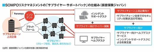 SOMPOリスク社は製造などのサプライチェーンを狙った攻撃への対応に注力している。協力企業を脅して大企業を揺さぶる悪質な手口だ。供給サイドはセキュリティが脆弱な傾向にある。SOMPOリスク社は9月から、供給網を抱える上流の企業と同時に下流の中小企業に対してもセキュリティ対策を行う「サプライヤー・サポートパック」の提供を始めた。
