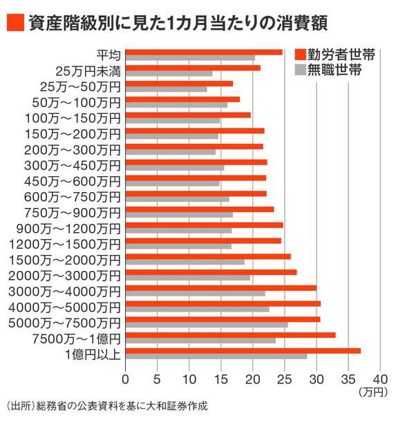実際に2019年における資産階級別の1カ月当たりの消費額をみると、いずれの資産階級においても、勤労者世帯に比べて無職世帯の消費額が低い傾向にある。とりわけ、資産規模が1億円以上の世帯においても、勤労者世帯と比べ、2割程度低い。